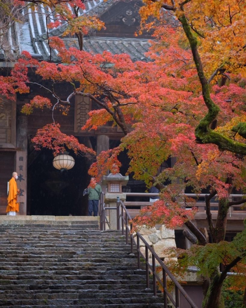 秋になると紅葉が境内を彩り、三重宝塔の周辺や本堂の奥、奥の院から境内をぐるりと一周できる岡寺参道は、さながら紅葉のトンネルのようになる。