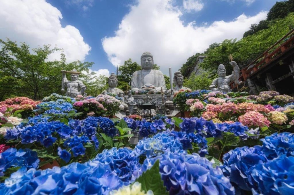 春は桜、夏は新緑、秋は紅葉、冬は雪と、四季折々の衣をまとった大仏様で知られる壷阪寺(つぼさかでら)。初夏には、大仏様の周囲から観音様に続く参道が紫陽花で彩られ、参拝者を迎えてくれます。