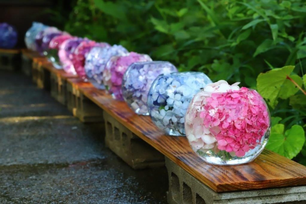 色とりどりのあじさいが美しいアジサイガラスボールが境内のいたるところに飾られ、訪れる人の目を楽しませてくれます。水と花の入れ替えは毎日おこなわれ、同じ場所でも日によって違う色合いが見られるそう。何度でも訪れたくなりますね。