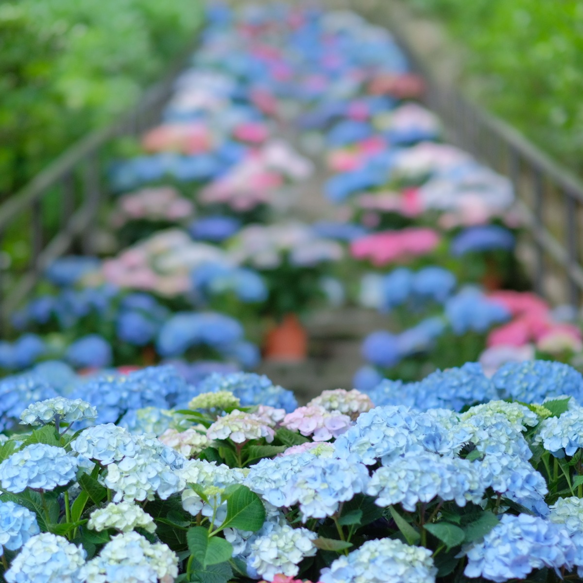 仁王門をくぐって登廊をまっすぐ進んだところに「嵐の坂」と呼ばれる左右をあじさいに挟まれた石段があります。この嵐の坂に、色とりどりのあじさいの鉢植えが並べられ、下から見上げても上から見下ろしても壮観!
