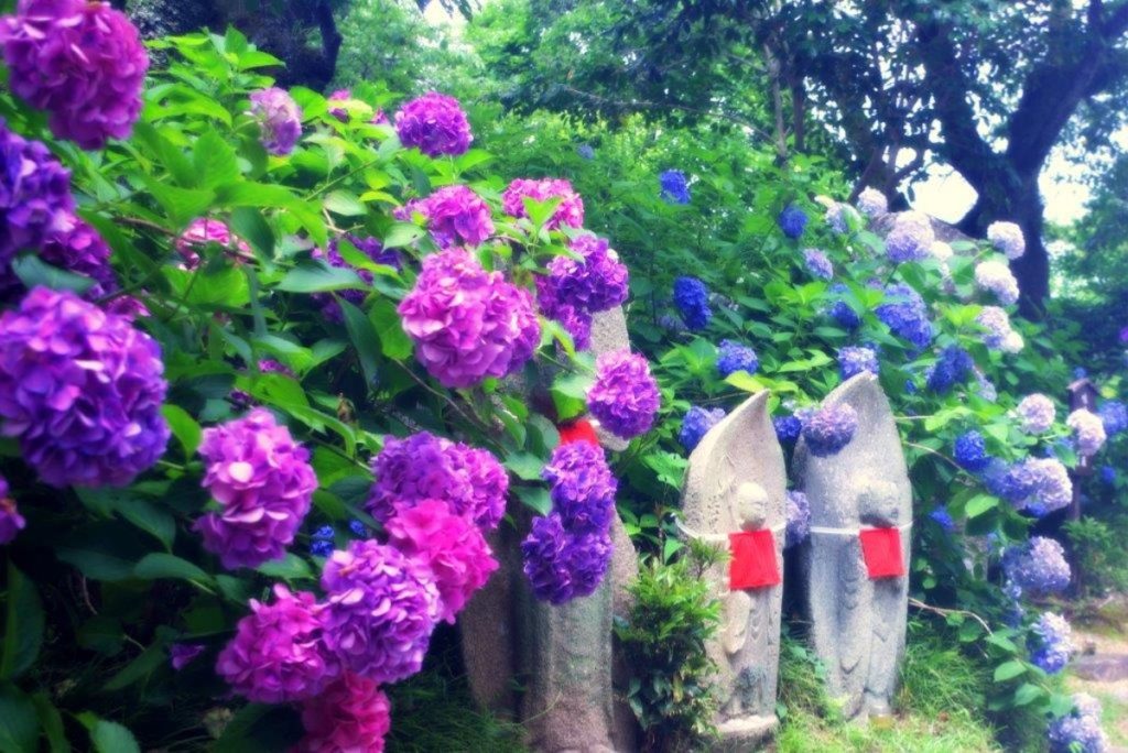 日本のお地蔵さま発祥の地といわれる矢田寺では、あじさいの中にたたずむお地蔵さまの姿が見られます。はなやかなあじさいに囲まれておだやかな表情を浮かべるお地蔵さまに心が和みます。