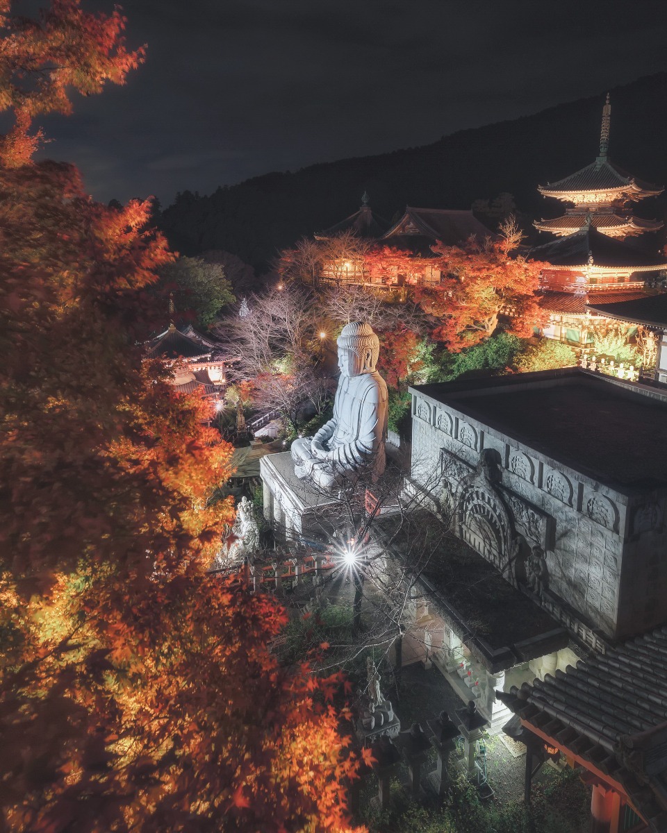 鮮やかな朱色の堂塔伽藍や重要文化財である三重塔、インドよりご招来された巨大石仏像が紅葉に包まれる景色は、壷阪寺ならではの風情ある風景。