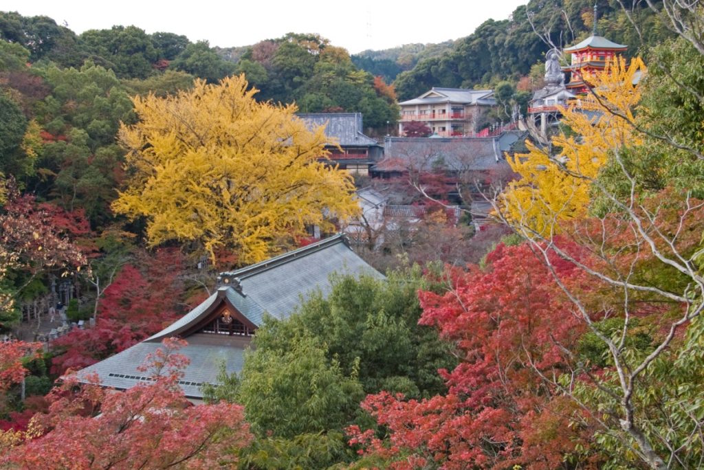 紅葉の時期には、広い境内のいたるところで、モミジの赤やイチョウの黄色と、緑の木々が絶妙に混じり合った美しい景色が見られる。さらには、周囲の山々も鮮やかに色づき、遠くに望む奈良盆地も素晴らしい眺めだ。
