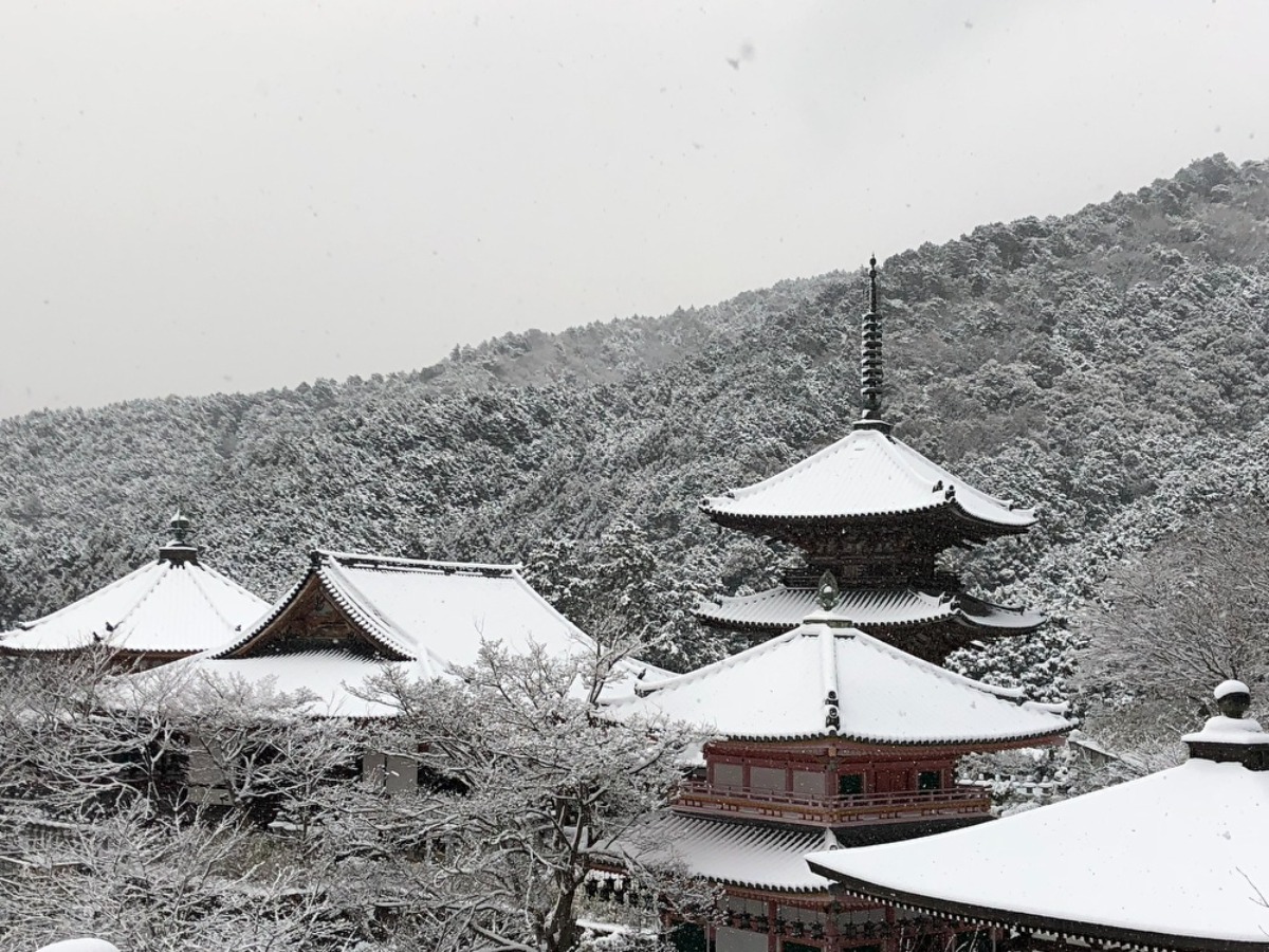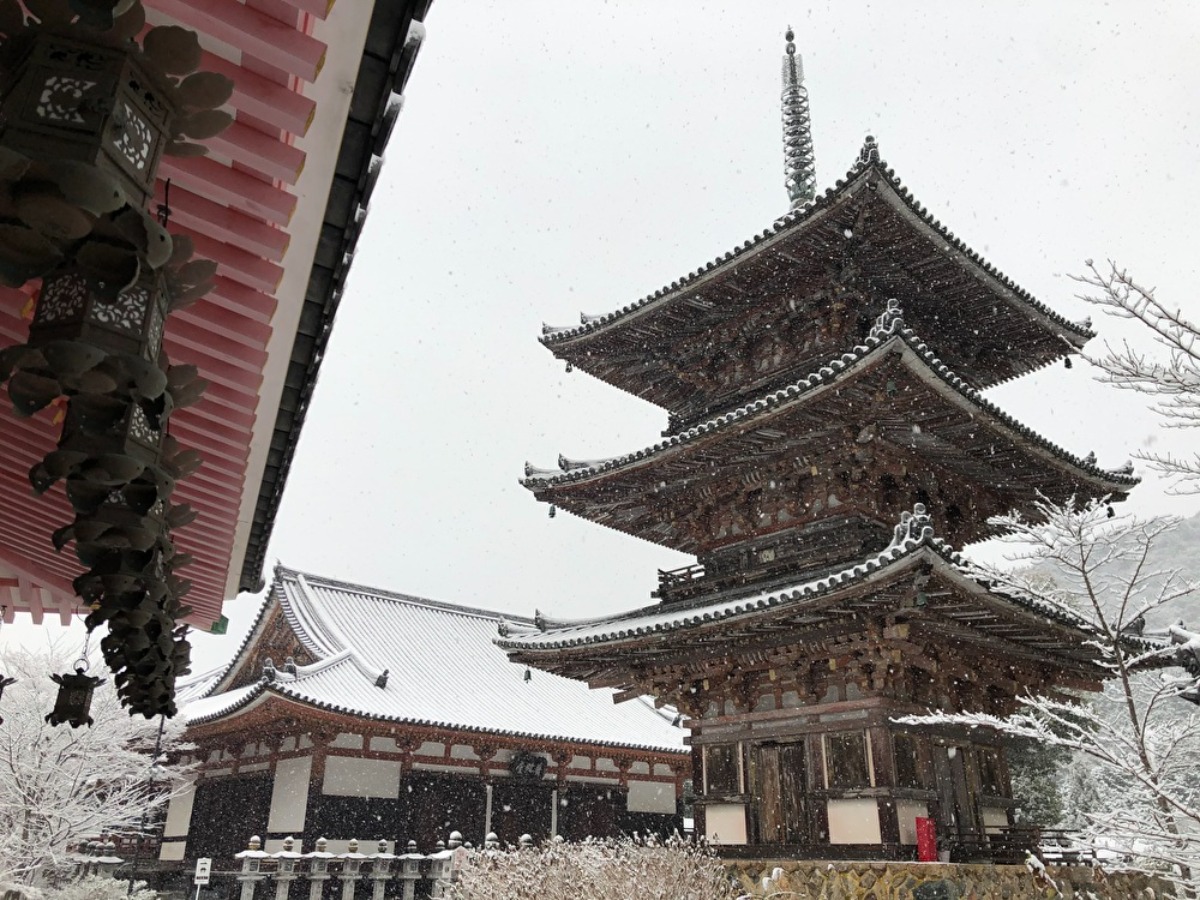 壷阪の山の上に建つ壷阪寺の冬は下界よりも厳しく、伽藍や大仏さまが雪で覆われることも。その絶景を見るために訪れる人も少なくない。