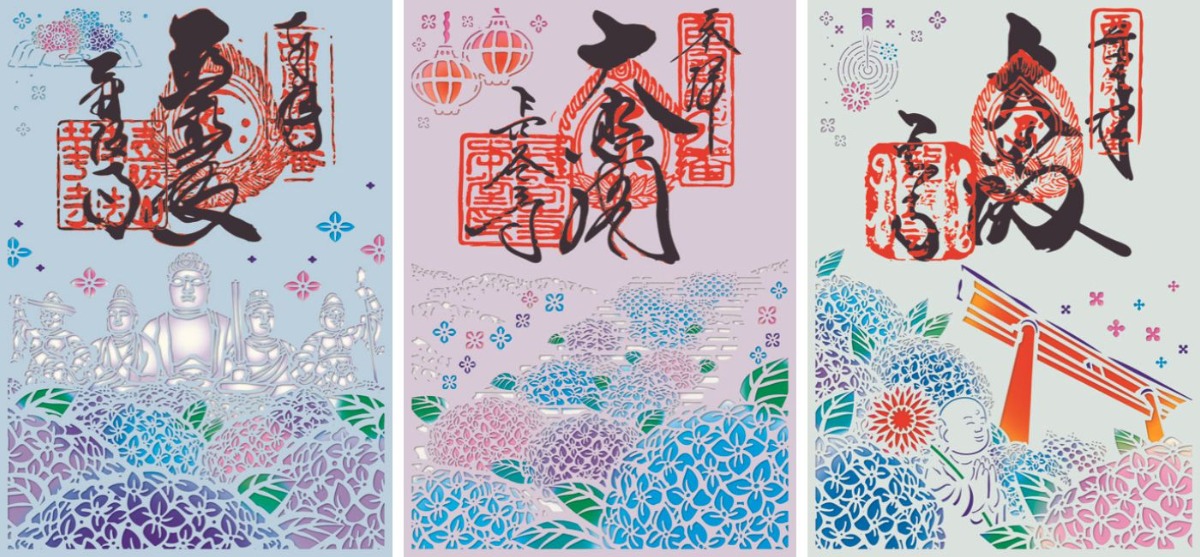 「あぢさゐ回廊」の期間中は各寺特製の紫陽花切絵朱印の授与があり、3ヶ寺の切絵朱印を納める特製台紙が販売される。