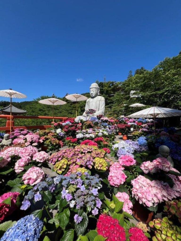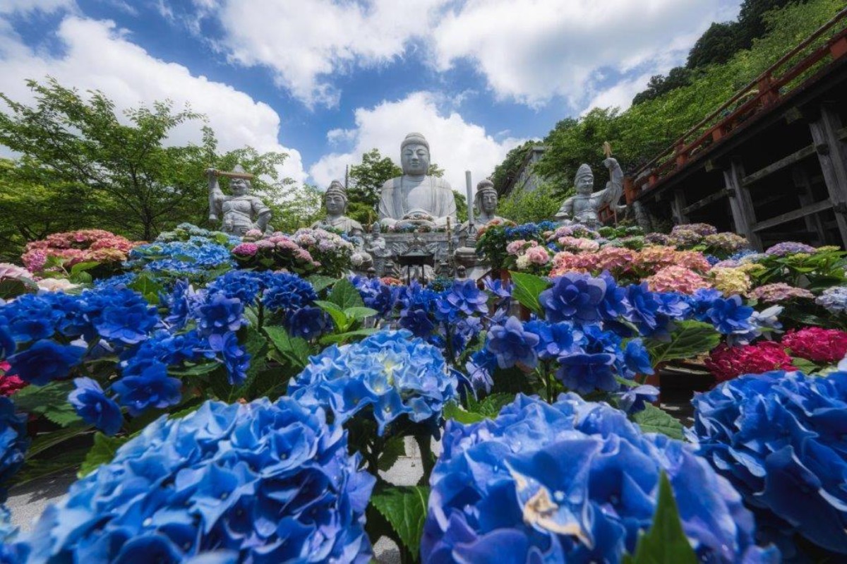 眼病封じのお寺として知られる壷阪寺。春は桜、夏は新緑、秋は紅葉、冬は雪と、四季折々の衣をまとった全長10mの大仏様(大釈迦如来石像)の姿も有名。この初夏には、春に「桜大仏」として楽しませてくれた大仏様の周囲から観音様に続く参道が紫陽花で彩られ、参拝者を迎えてくれる。