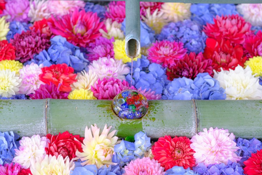 飛鳥の地に建立され1300年以上の歴史を刻む岡寺は、日本で最初の厄除け霊場としても信仰を集め、特に女性の厄除けに霊験あらたかといわれている。早くから『華の池』や『華手水舎』などを行っており近年全国に広がる花手水のさきがけとも言われ、1年を通して多くの参拝者でにぎわう。