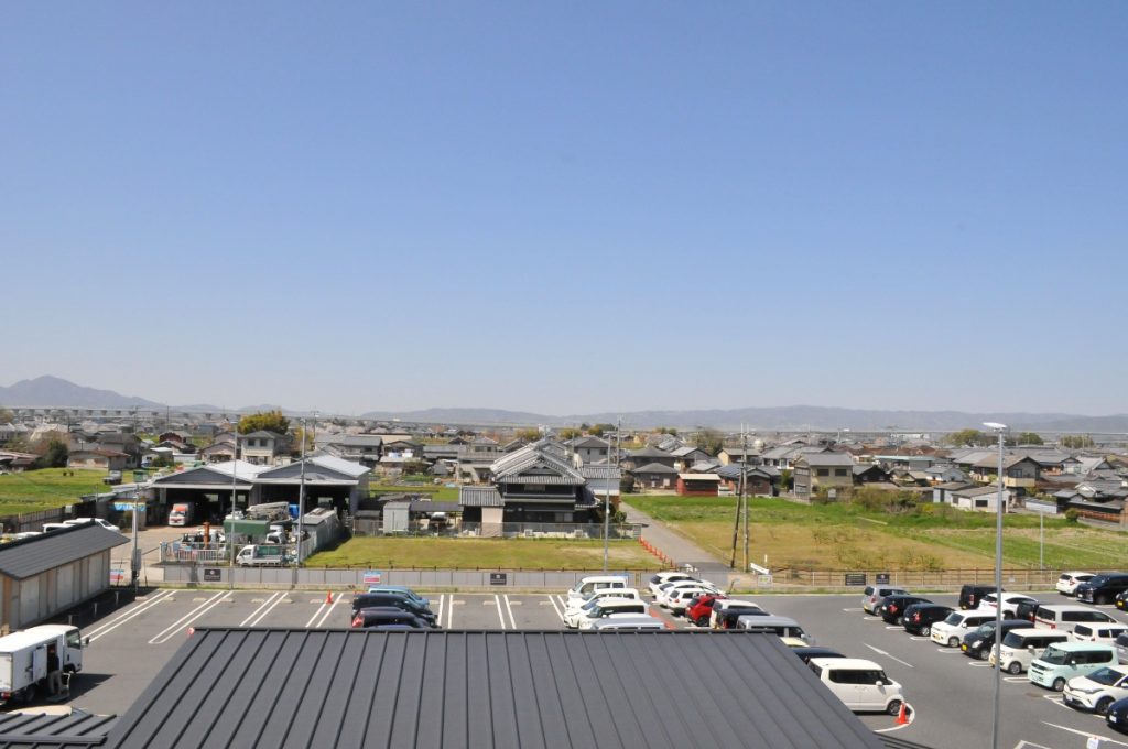 テラスからは、大和平野や『唐古・鍵遺跡史跡公園』を望むことができる。