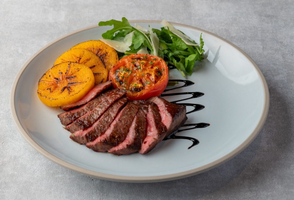 奈良のブランド牛『大和牛』をイタリア定番の牛肉料理であるタリアータで。バターでソテーすることで甘みが増した明日香村の柿と一緒に食べるとさらに美味!