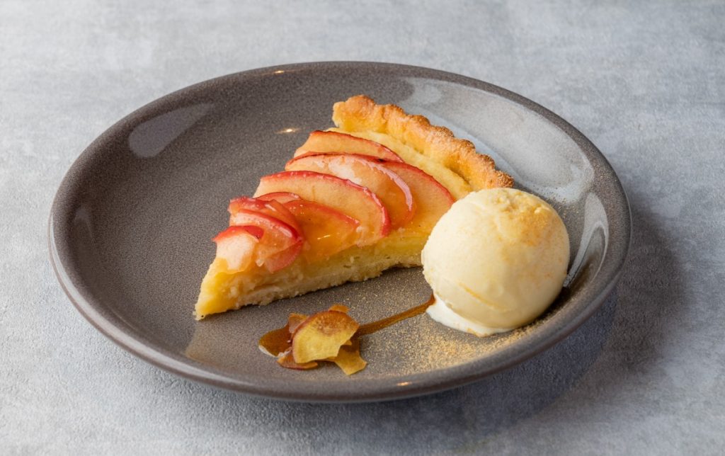 強い甘みとねっとり食感の紅はるかと、しゃっきり甘酸っぱい林檎を米粉のタルトでまとめたスイーツ。植村牧場の牛乳を加え、コクのあるフィリングに仕上がっている。