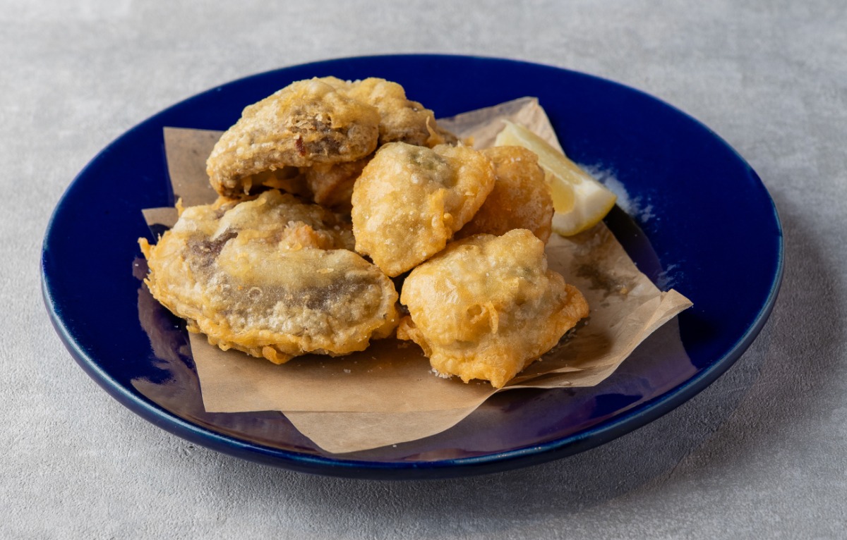 明日香村のねっとり美味しい里芋を、イタリア郷土料理ゼッポリーニに仕立てた。吉野町の肉厚で旨みの濃い原木しいたけのフリットと合わせ、シンプルに塩とレモンで!