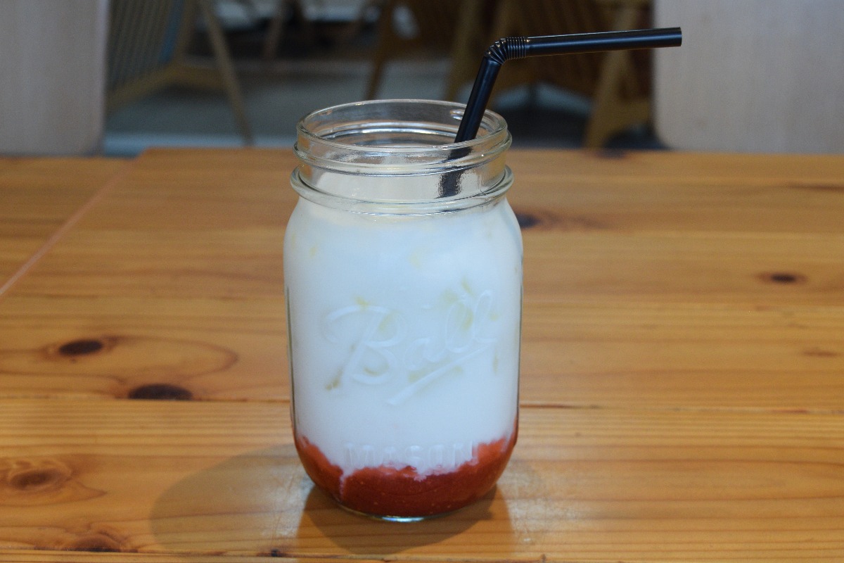 自家製いちごソースがたっぷりと入った古都華ミルク。