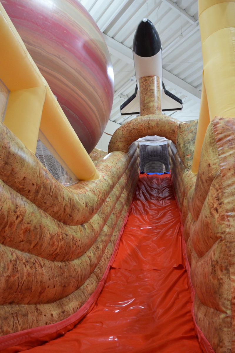 宇宙探検をイメージした大型のエア遊具には、2つのスライダーやロープクライム、宇宙基地を模したボールプールやトランポリンなど、楽しい要素が盛りだくさん。