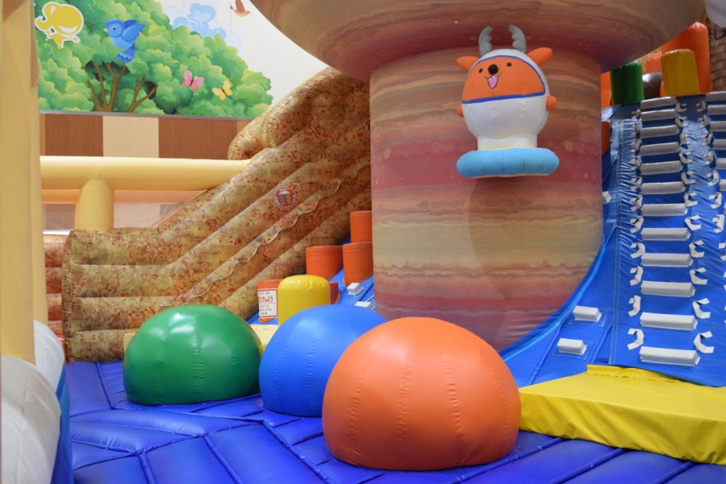 宇宙探検をイメージした大型のエア遊具には、2つのスライダーやロープクライム、宇宙基地を模したボールプールやトランポリンなど、楽しい要素が盛りだくさん。