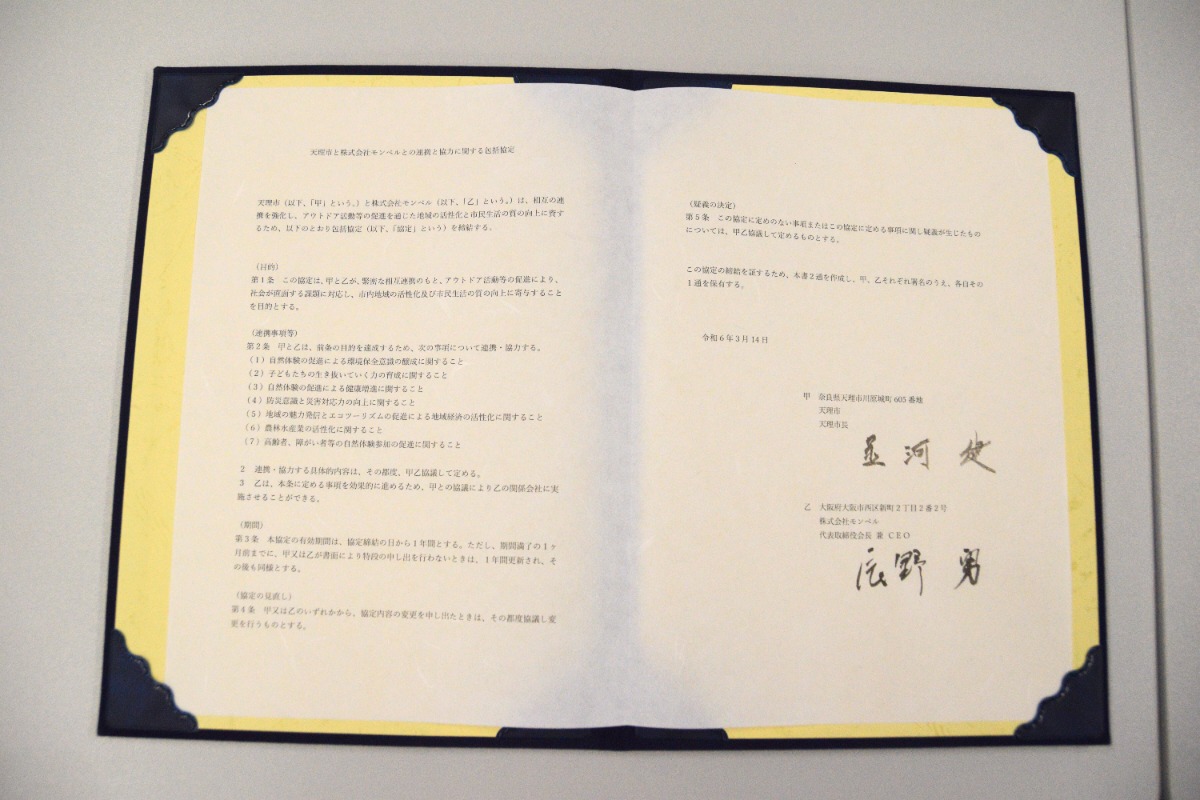 天理市が緊密な相互連携のもと、アウトドア活動等の促進により、地域の活性化及び市民生活の向上に資するため、今回株式会社モンベルと包括協定を締結した。