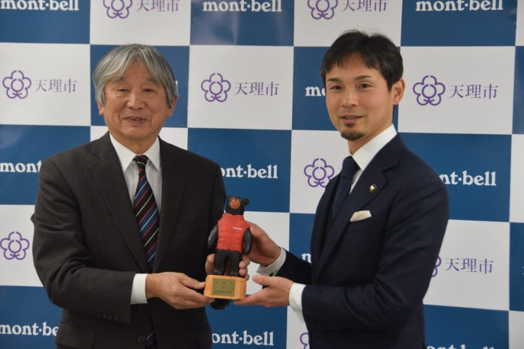 特別にモンベルのマスコット「モンタベア」のフィギュアも天理市に贈呈