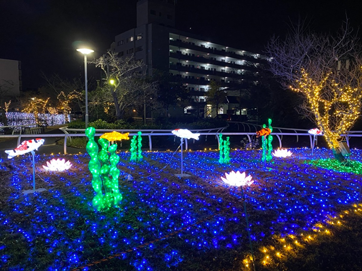 池の水面に映る光も幻想的で、冬の夜の思い出づくりにひと役買うこと間違いなし。