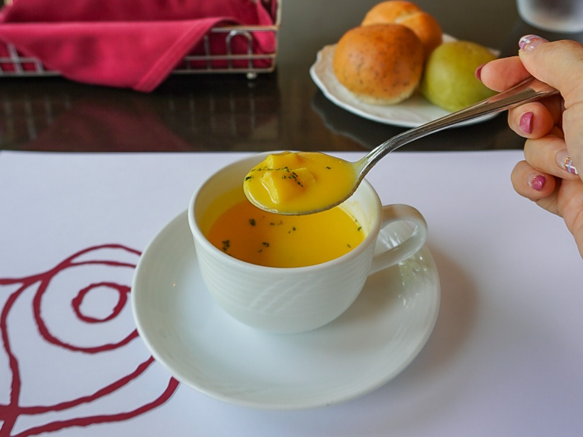この日のスープはニンジンとジャガイモのポタージュでした。お野菜ならではのほっこりした甘みが味わい深いスープです。