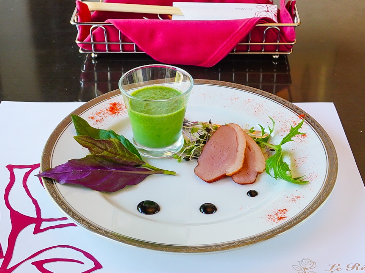 旨味たっぷりの鴨肉、そして色々な野菜が盛り付けられています。葉の裏が紫色をした珍しい野菜は金時草、緑と紫の色合いが美しいですね。