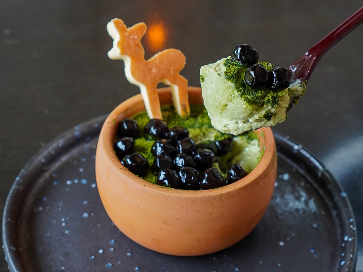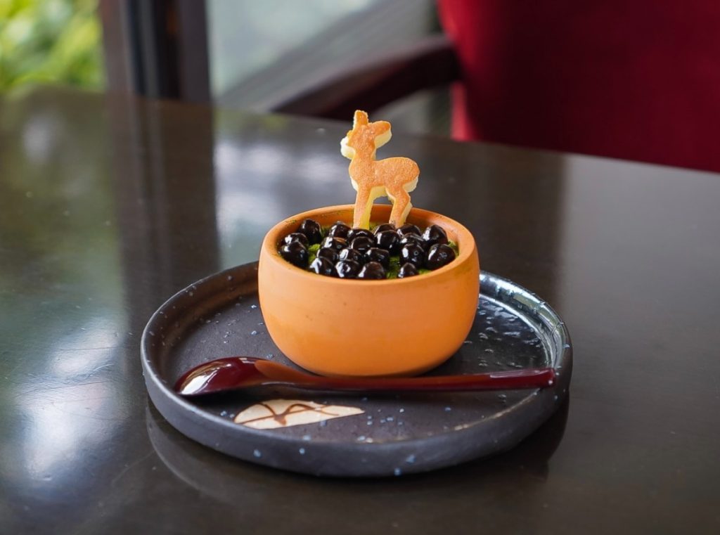 奈良らしい一品、メニュー名は「ルレーヴのプリン」ですが、お店の方はにっこり優しい笑顔で「鹿ふんプリンです。」と呼んでおられました。
