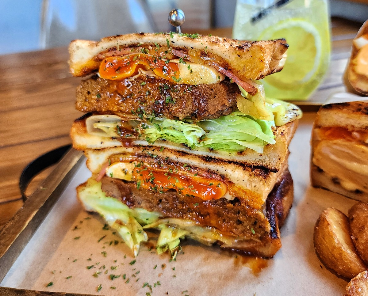ボリューミーな自家製ハンバーグにトロトロの目玉焼きとカリカリベーコン、とろ~りチーズとシャキシャキレタスをはさんだロコモコサンドは蜂蜜入りの甘辛ロコモコソースが味の決め手!!