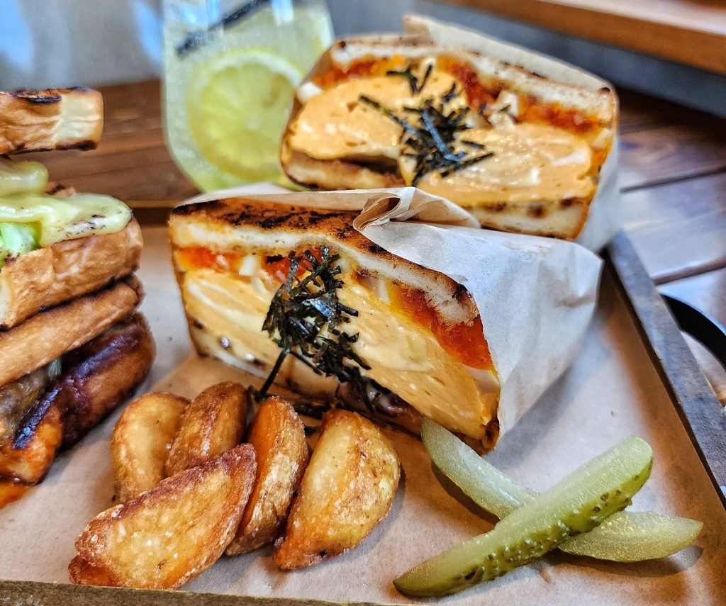 だし巻きと濃厚な旨みの煮卵をからしマヨネーズでまとめた、シンプルながらクセになる味の絶品ホットサンドは電話予約がおすすめ。