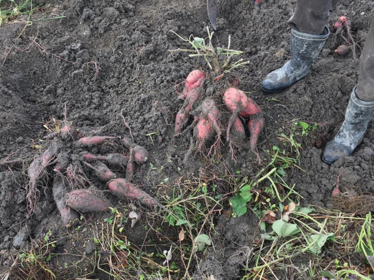 山の辺の道沿いの崇神天皇陵横の畑でピーナッツ、サツマイモ、里芋の収穫体験ができる。