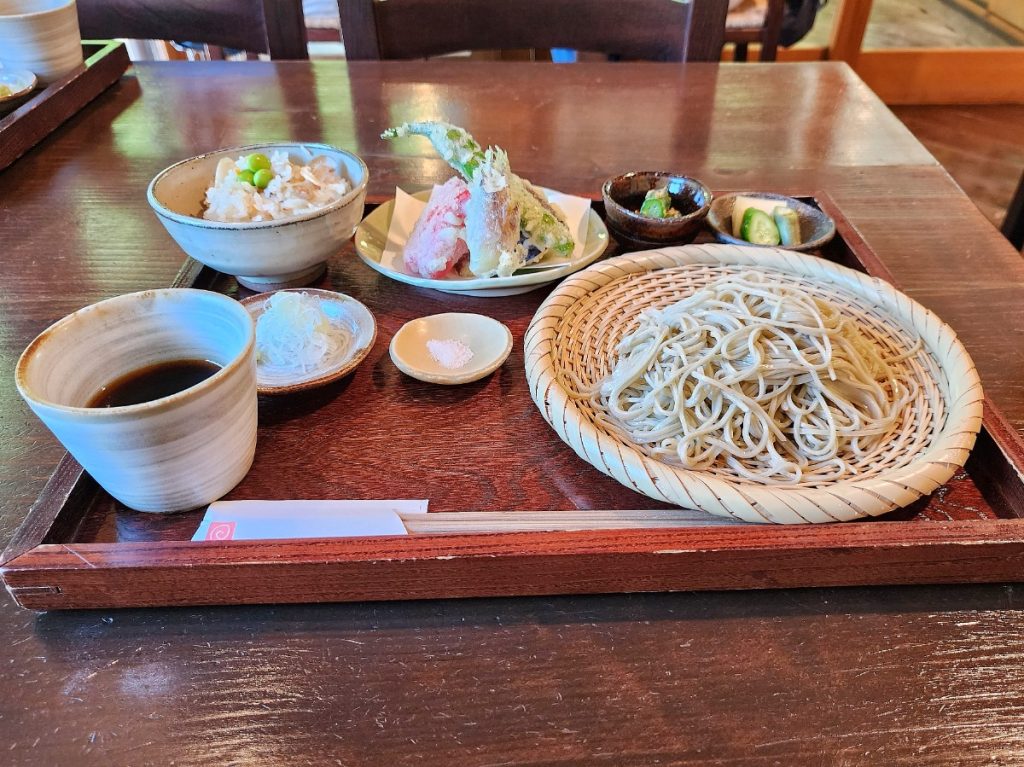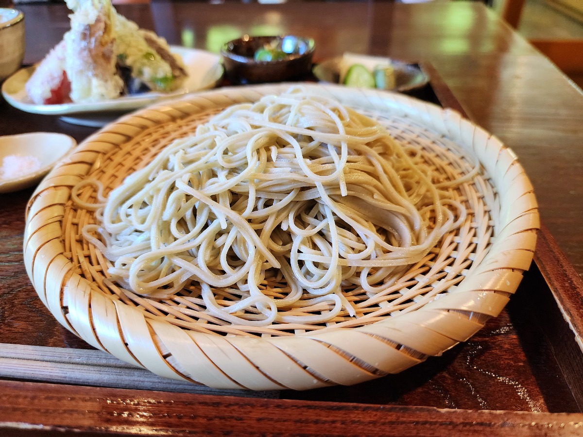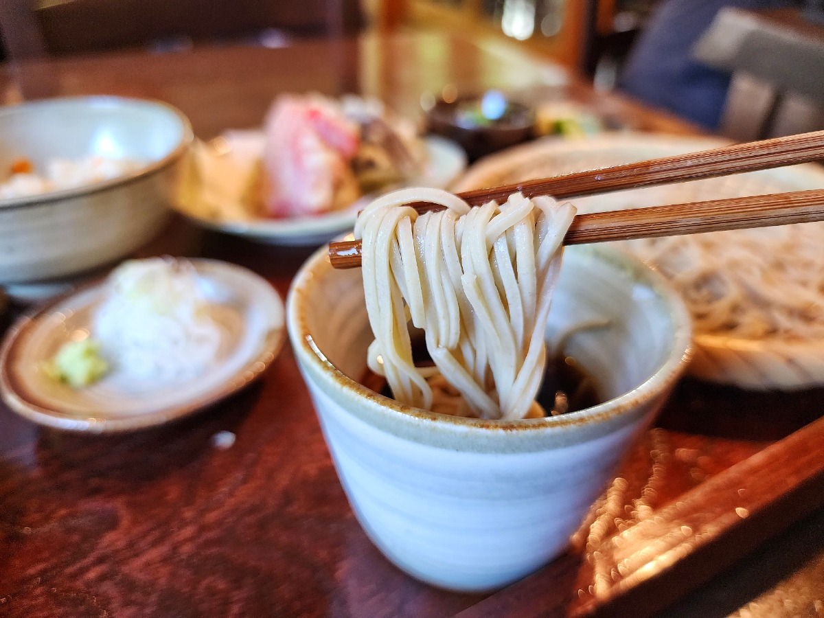 細めでしっかり歯応えのあるお蕎麦はそば粉の風味を味わうためまずはそのままでいただき、そのあと出汁が効いた濃いめのそばつゆに半分くらいつけて味わいます。