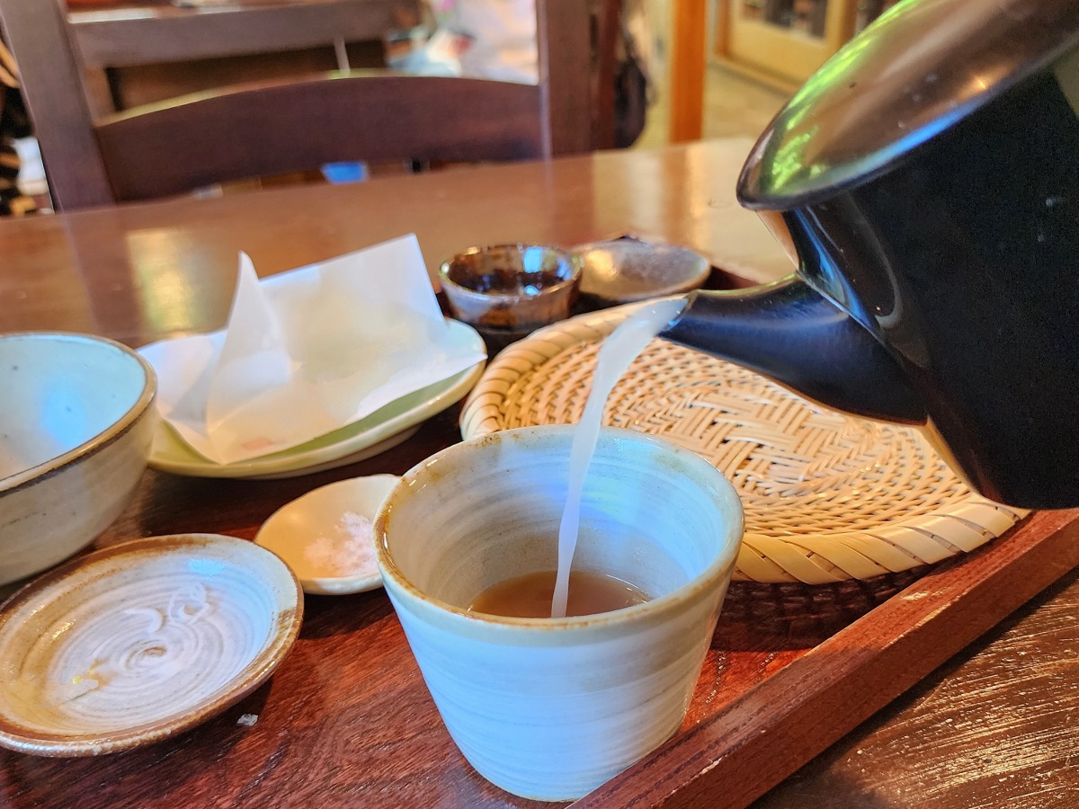〆にいただいたそば湯にほっこり。このお店そしてこの定食はわざわざこれだけの為に来る価値ありますよ!