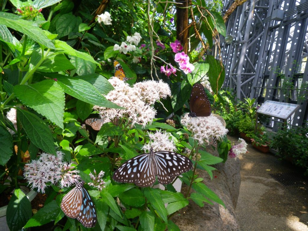 人気の放蝶温室では、亜熱帯の花や植物が生い茂る中、500個体を越える色とりどりの蝶が目の前を飛び交うという貴重な体験ができる。
