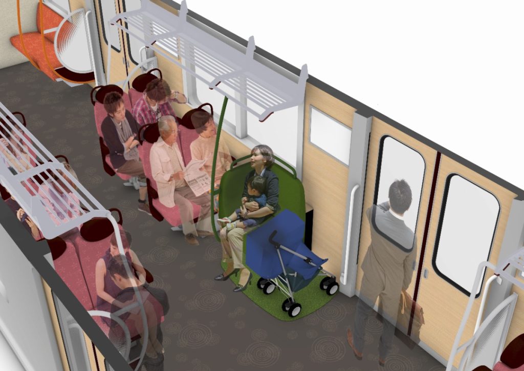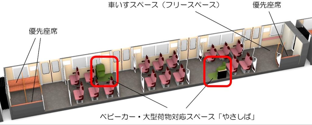 ・各車両に1カ所の車いすスペース(フリースペース)を設ける、出入口の高さを下げてホームとの段差を低減し、乗降しやすくするなどバリアフリー対応