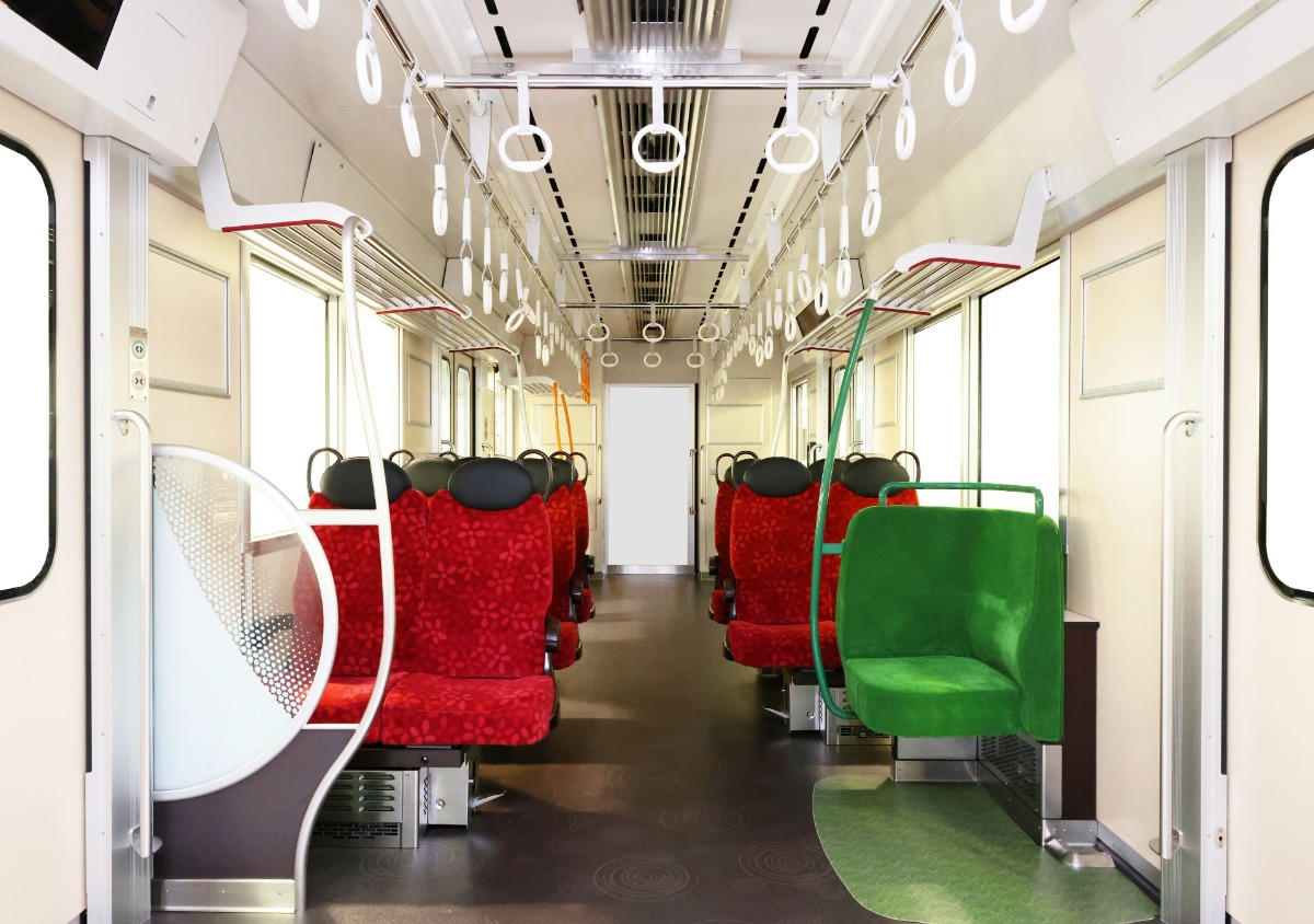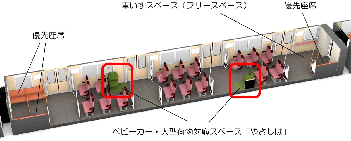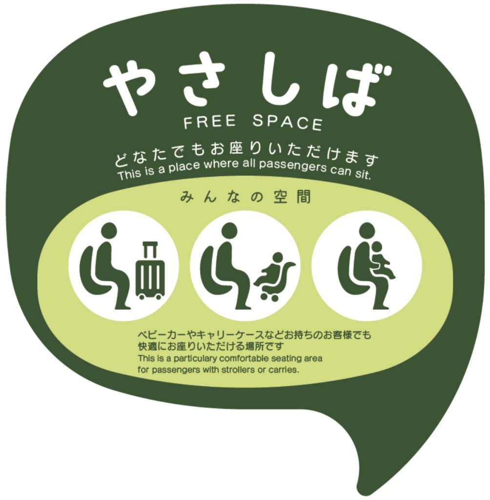 ベビーカーや大型荷物などを持っている人が気兼ねなく着席して過ごせるスペース「やさしば」を1両あたり2カ所設置。このスペースには、キャリーバックやスーツケースなどのキャスターのひとつを掛けて荷物を動きにくくするストッパーを設置する。