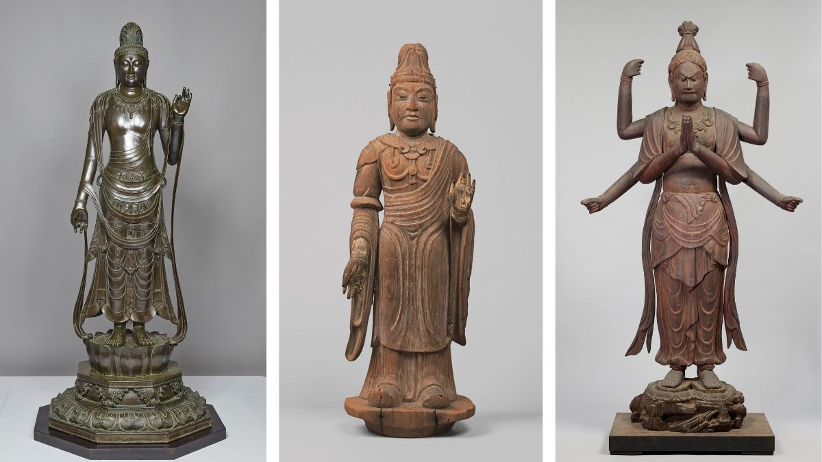 (左)国宝 聖観世音菩薩立像 飛鳥~奈良時代 7-8 世紀 薬師寺蔵 画像提供:奈良国立博物館(中央)天部形立像(伝帝釈天) 平安時代 9-10 世紀 唐招提寺蔵 画像提供:奈良国立博物館(右)重要文化財 馬頭観音菩薩立像 飛鳥時代 8世紀 大安寺蔵 展示期間:8月6日~9月1日 画像提供:龍谷ミュージアム