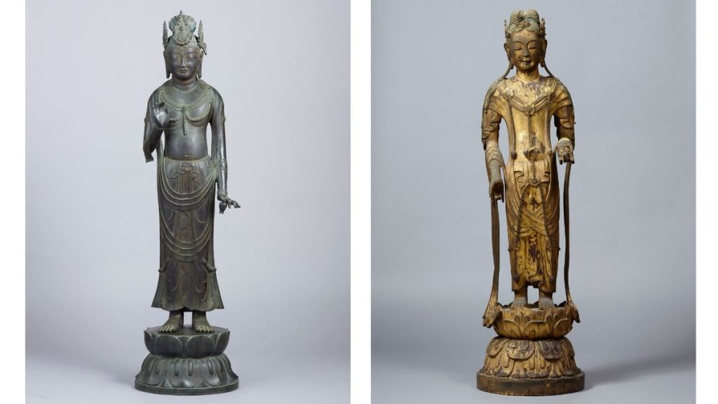 (左)国宝 観音菩薩立像(夢違観音) 飛鳥~奈良時代 7-8世紀 法隆寺蔵 展示期間:7月6日~8月4日 画像提供:奈良国立博物館 (右)重要文化財 文殊菩薩立像 (法隆寺六観音のうち) 飛鳥時代 7世紀 法隆寺蔵 画像提供:奈良国立博物館