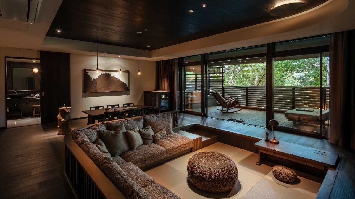 2.奈良の伝統の息遣いを感じられる趣ある佇まいと自然と調和するインテリアが施された客室。全43客室のうち23室は専用温泉風呂/露天風呂付き。