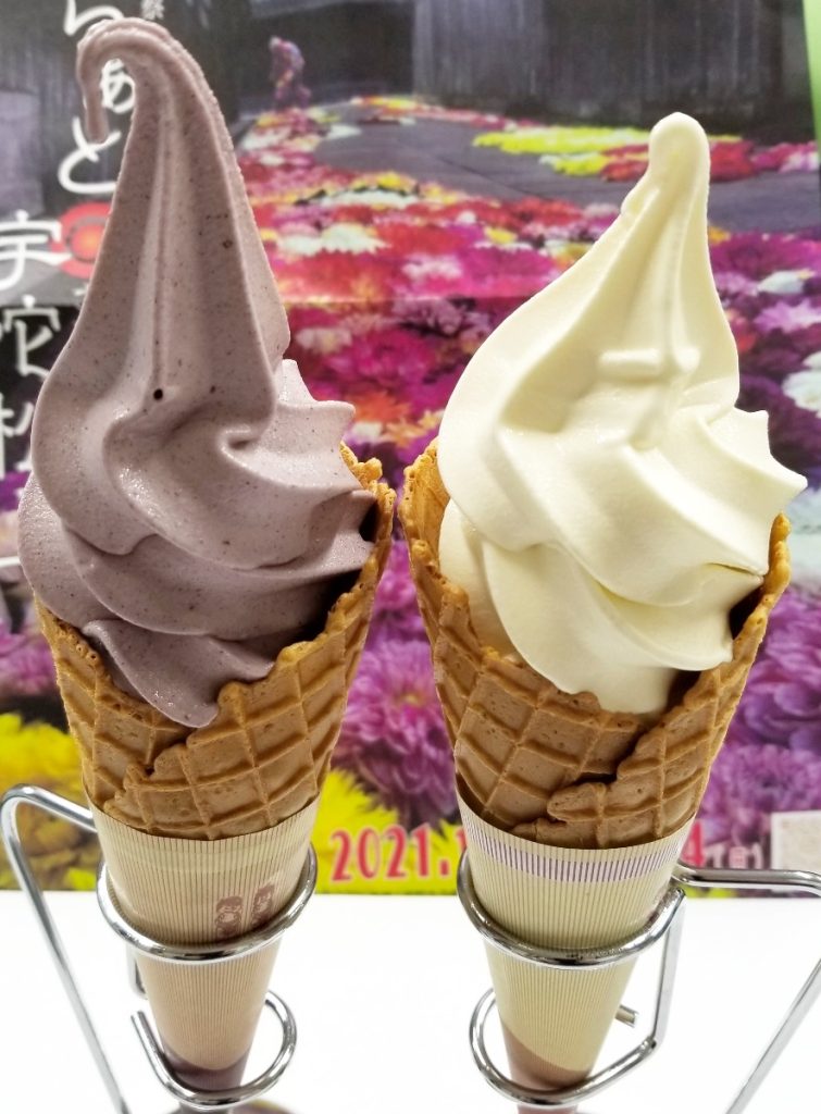 左:大宇陀ブルーベリーソフトクリーム 400円(税込)/右:吉野本葛ソフトクリーム 400円(税込)