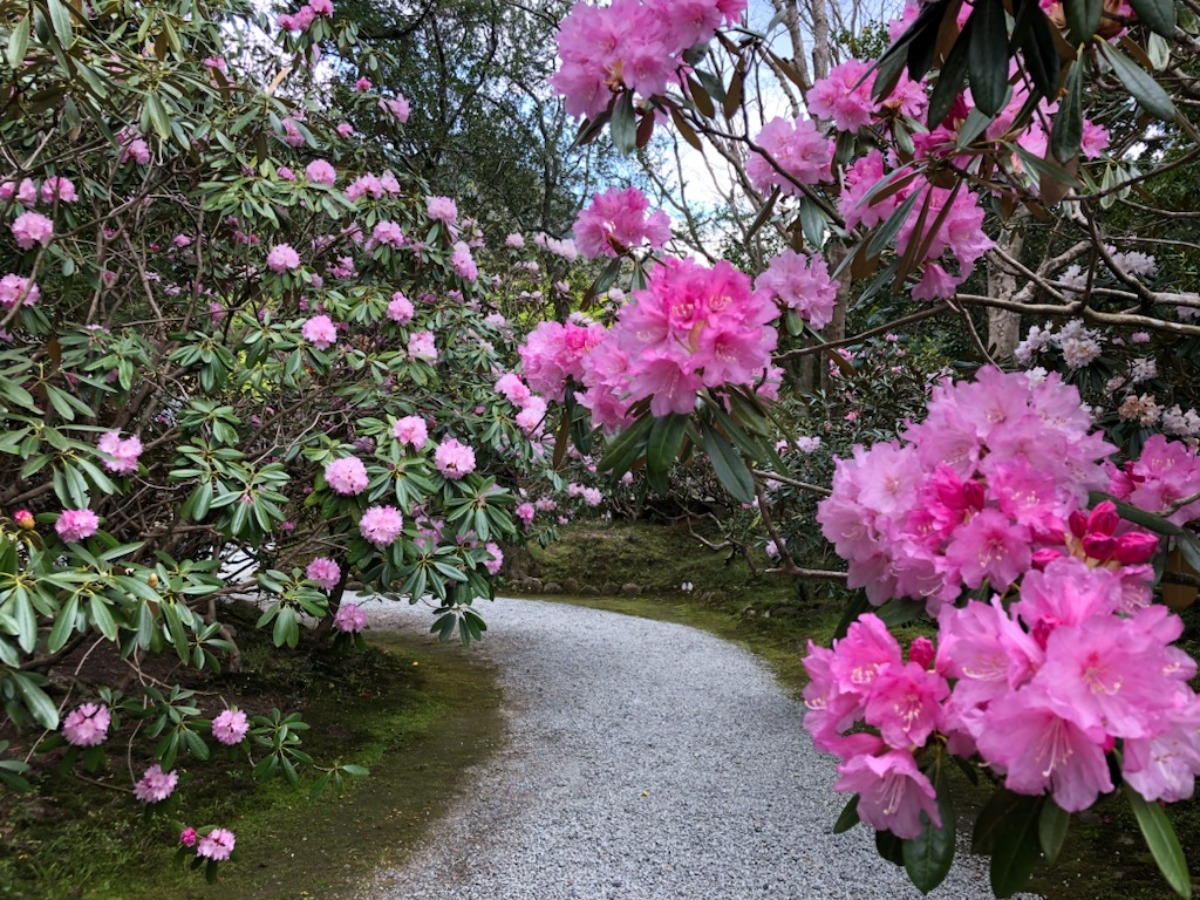 花は、咲き始めてから散るまでに、鮮やかな紅色から薄桃色、そして白へと色を変える。様々な表情を見せてくれるしゃくなげの花を眺めながら境内をゆっくり散策してみよう。