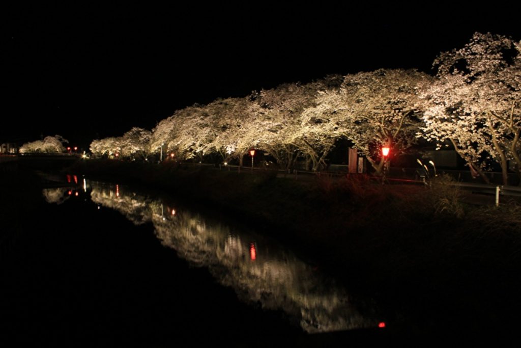 例年、開花期間中はライトアップされ、幻想的な夜桜を楽しむこともできる。川面に映る桜も幻想的で美しい。
