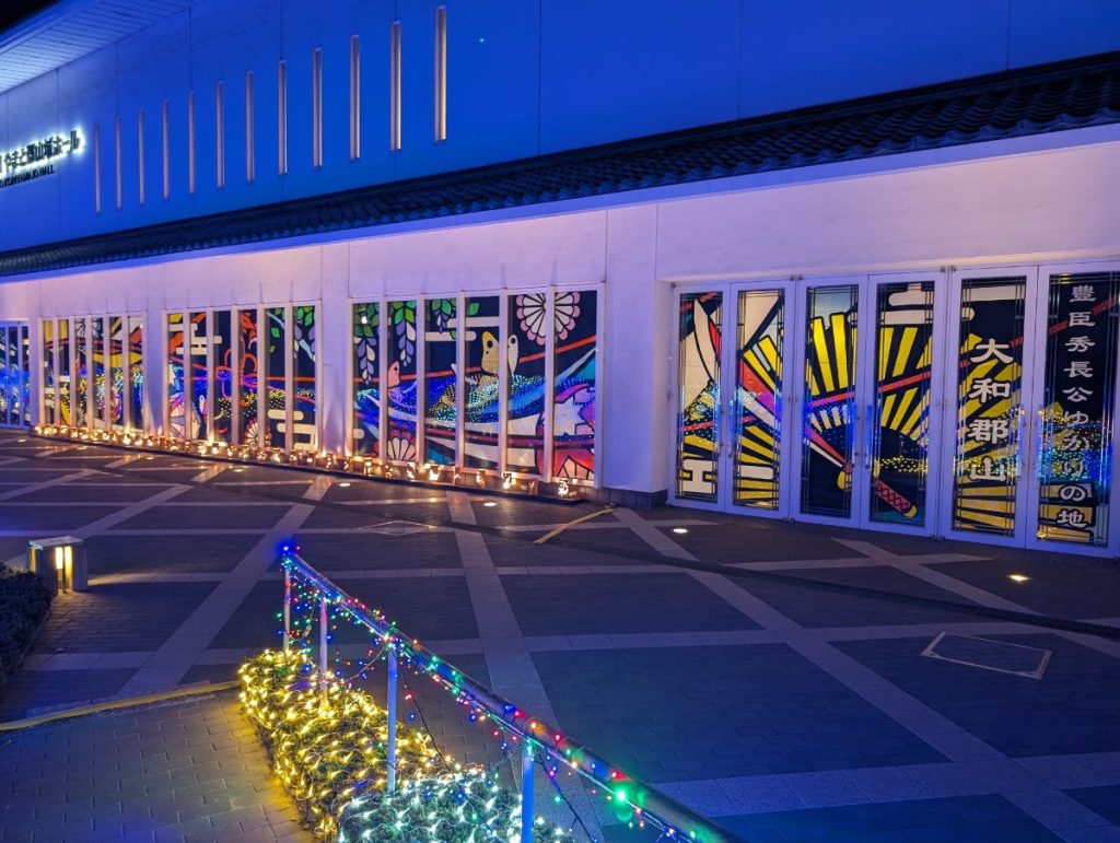 年々スケールアップして今年もさらにエリアを拡大。色とりどりのLEDがDMG MORI やまと郡山城ホールを彩る。正面玄関植栽もイルミネーションで飾られ、まるで光の中を歩いているよう。