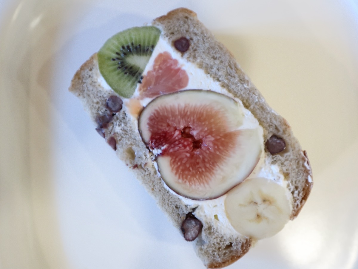奈良産のほうじ茶が入ったほうじ茶パンでサンドされたフルーツサンド。大ぶりにカットされたフルーツは口に入れるとジュワッと果汁があふれる。これからの寒くなる季節にはいちごが登場する予定。