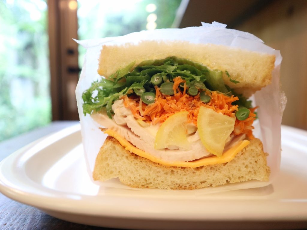 「レモンチキンチーズサンド」は塩レモンとはちみつにつけ込んで作った自家製の鶏ハムをサンド。柔らかな鶏と爽やかなレモンの香りが食欲をそそる。