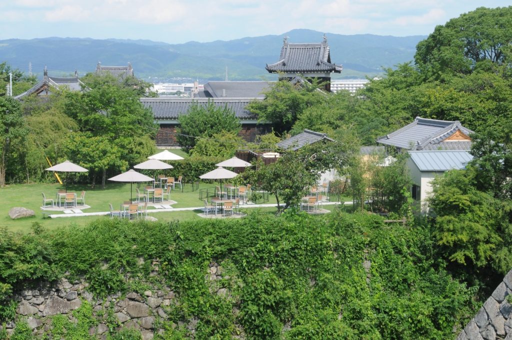 建物奥にはテラス席があり、郡山城跡の石垣やお堀を眺めながらカフェタイムを楽しむことができる。