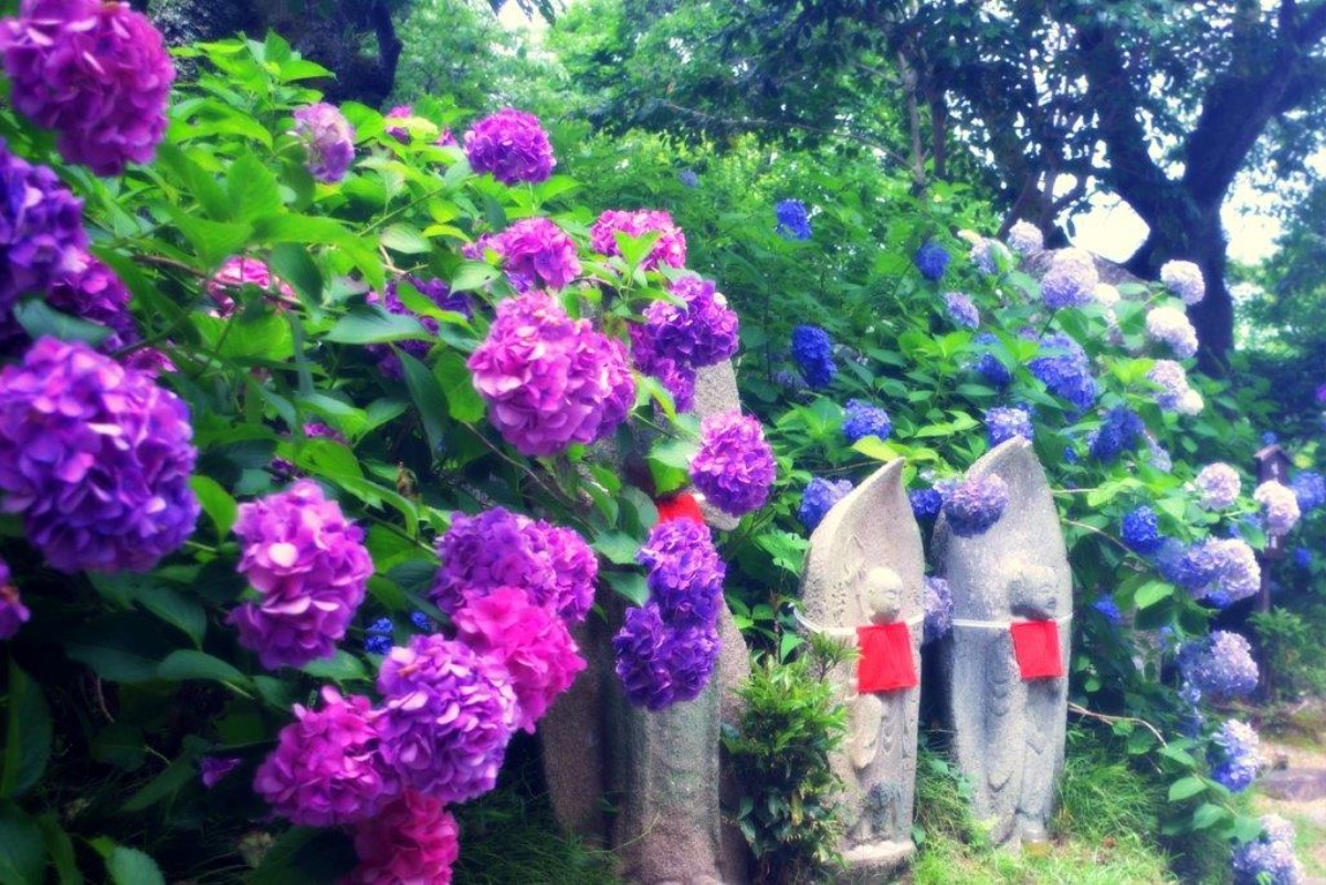 25,000㎡の境内には回遊式の「あじさい庭園」や種類豊富なあじさいが咲きそろう「見本園」もあり、見ごたえじゅうぶん。色や形も多種多様なので、ぜひ自分好みのあじさいを見つけてみよう。