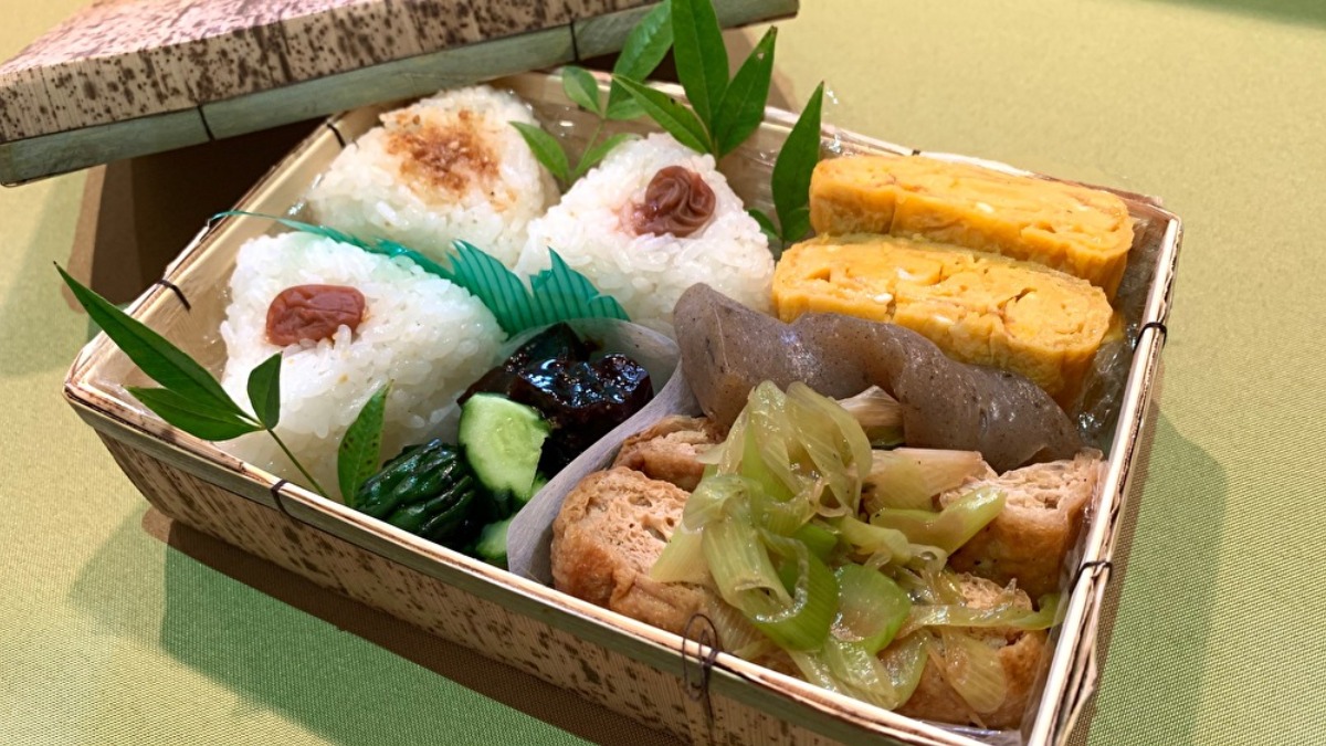 吉野の食材を活かしたお弁当で、大女将の心のこもった手作り。お弁当の中身はおにぎり、甘い卵焼き、お揚げさんと白ねぎの炒め煮、こんにゃくの甘辛煮、漬物(2種)と家庭的でその名のとおりうまいもんがぎっしり詰まっている。