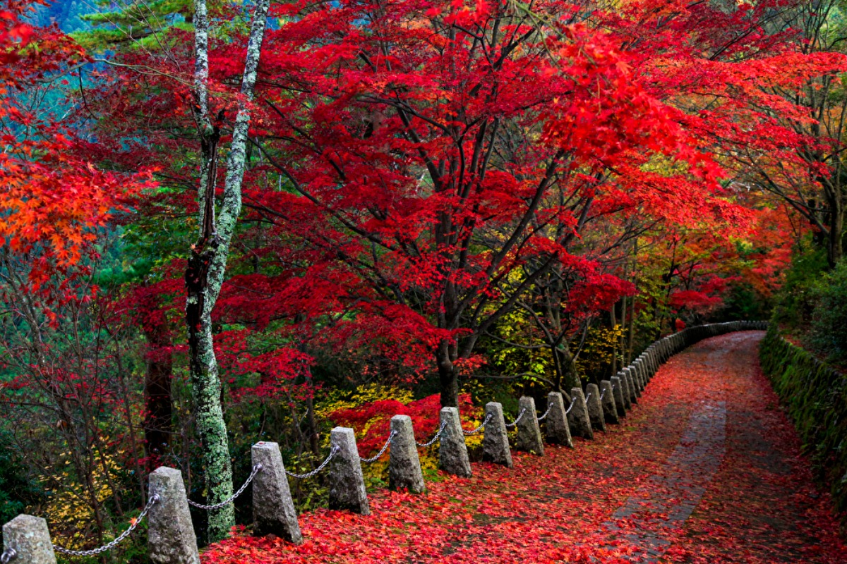 春には約3万本もの桜の木が満開になることで有名な『吉野山』。秋には、その葉が見事に紅葉へと変化する。
