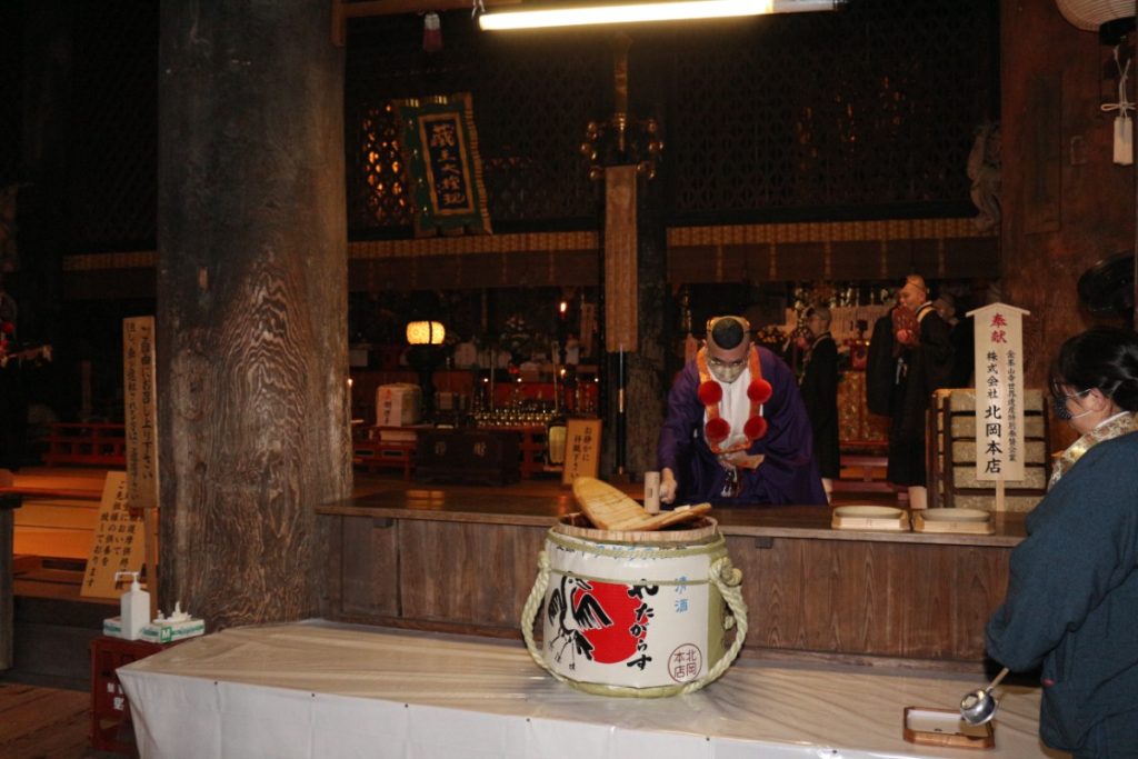 また、蔵王堂内では新年へのカウントダウンとともに鏡割りを行い、御神酒が振舞われる。