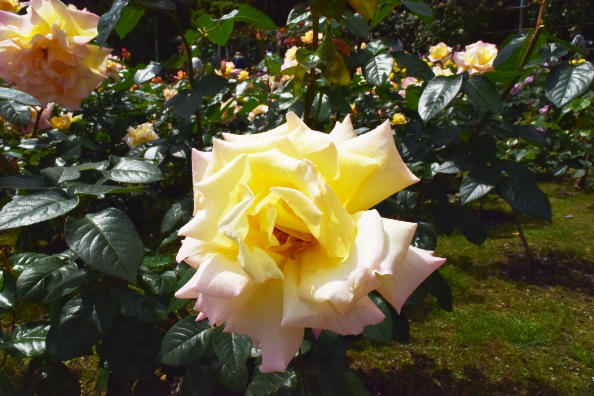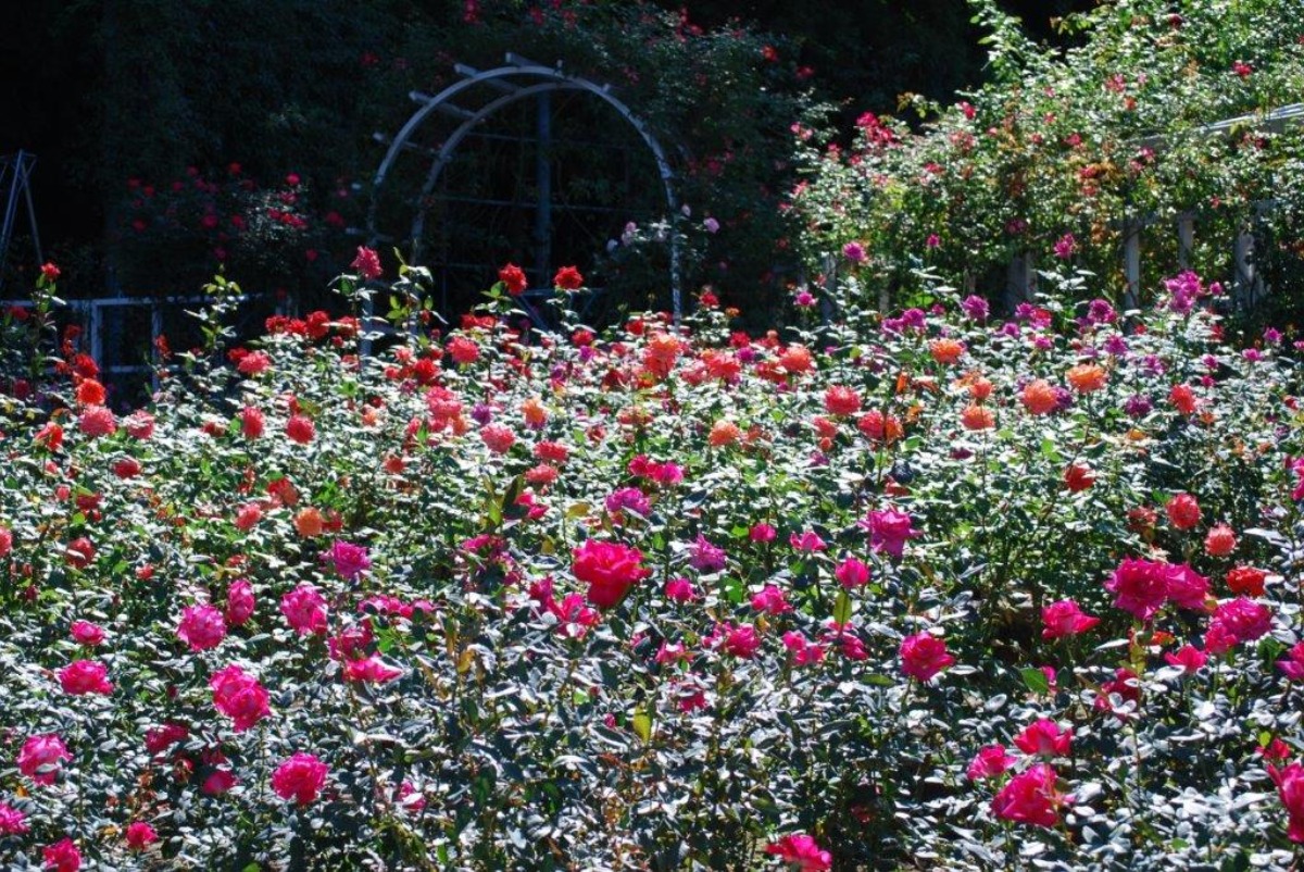 戦争終結を記念して作出された「ピース」という名のバラを中心に、つるバラ・四季咲き・ミニチュアローズなど、様々なバラが色とりどり目を楽しませてくれる。