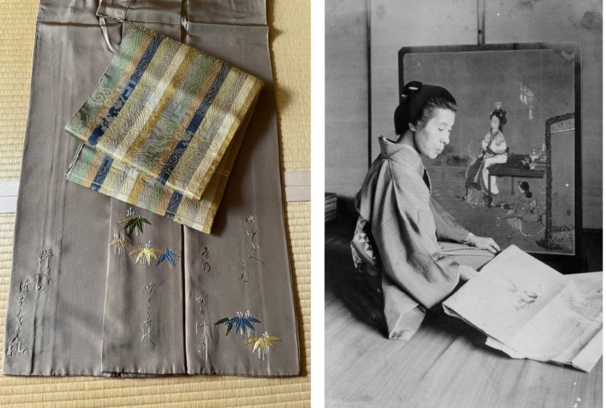 【左】上村松園の文化勲章受章時に 着用した着物と帯 【右】上村松園写真 ※本展で初公開の「唐美人衝立」 を背にした写真
