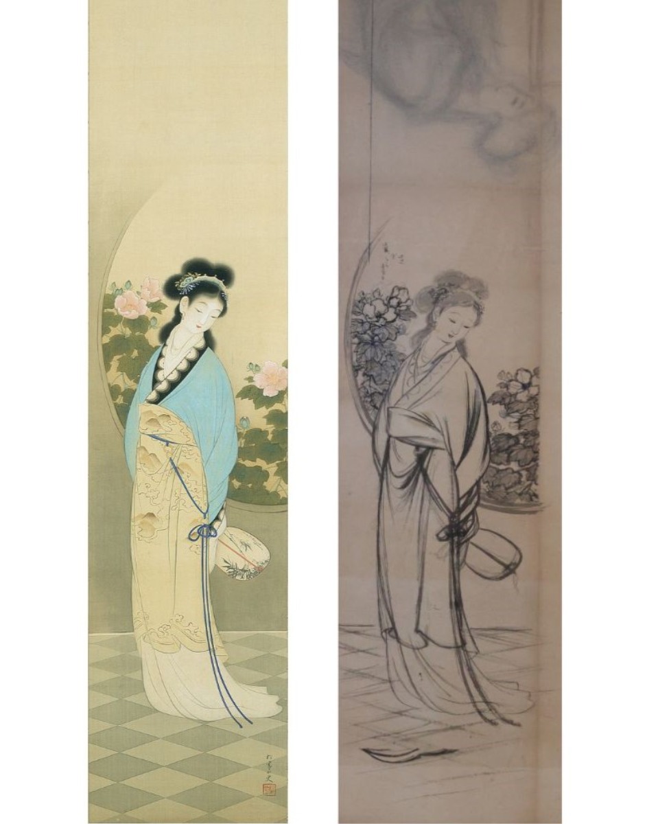 【左】上村松園「唐美人」[部分] 松伯美術館蔵【右】「唐美人(下絵)」[部分] (初公開) 松伯美術館蔵