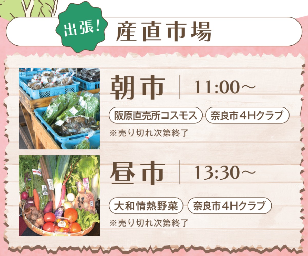 阪原直売所コスモスや大和情熱野菜、奈良市4Hクラブが参加し、生産者が育てた旬の野菜を直接購入できる。